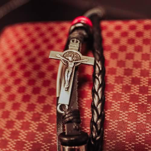 Ein bezauberndes Armband, verziert mit einem Kreuz mit dem Bild von Jesus Christus.