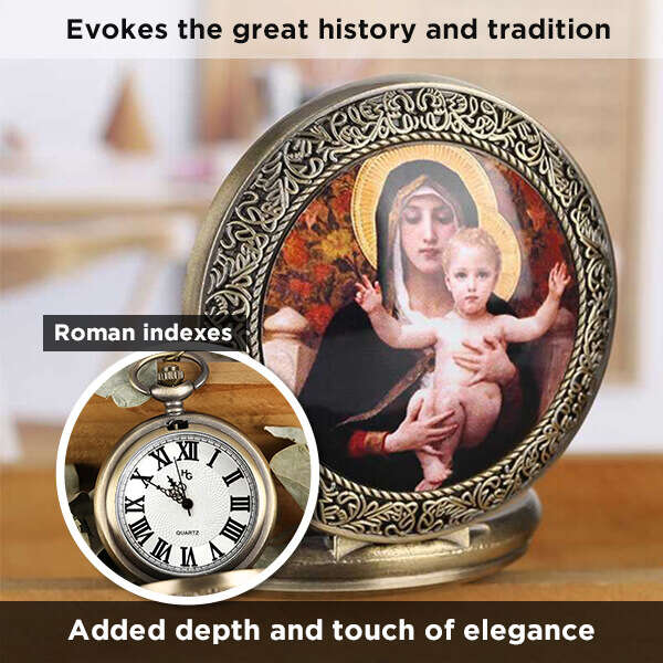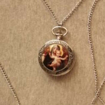 Relogio es un reloj de bolsillo con una ilustración espiritual de la Virgen María y Jesús.