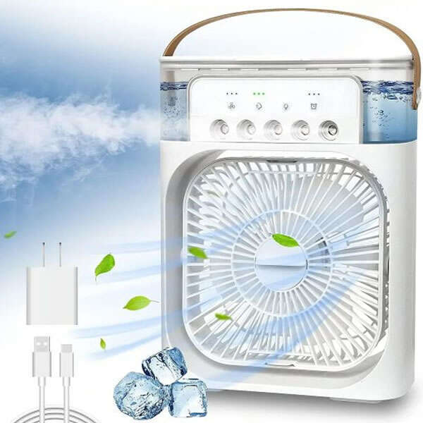 Ciesz się najwyższym komfortem podczas gorących letnich dni i nocy dzięki naszemu przenośnemu wentylatorowi z nawilżaczem i kolorowymi światłami.